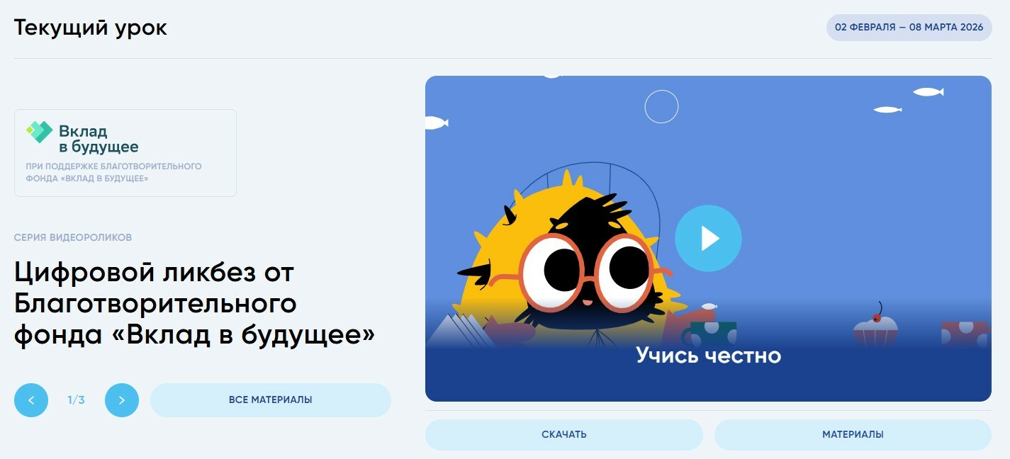 В этом году эксперты фонда «Вклад в будущее» представят три мультипликационных ролика по темам: «Учись честно», «Умная выгода» и «Дропперство: что это и чем опасно» (данный ролик создан при экспертной поддержке Департамента Кибербезопасности Сбера). К видеороликам прилагаются методические материалы. Материалы фонда являются практико-ориентированными и помогают развивать современные навыки, необходимые для безопасного нахождения в интернете. Видеоролики предназначены для возрастной категории 6+ и рекомендованы для просмотра с родителями или педагогами. Материалы проекта верифицированы ФГБНУ «Институт изучения детства, семьи и воспитания». Они размещены на сайте проекта и доступны всем желающим по ссылке: